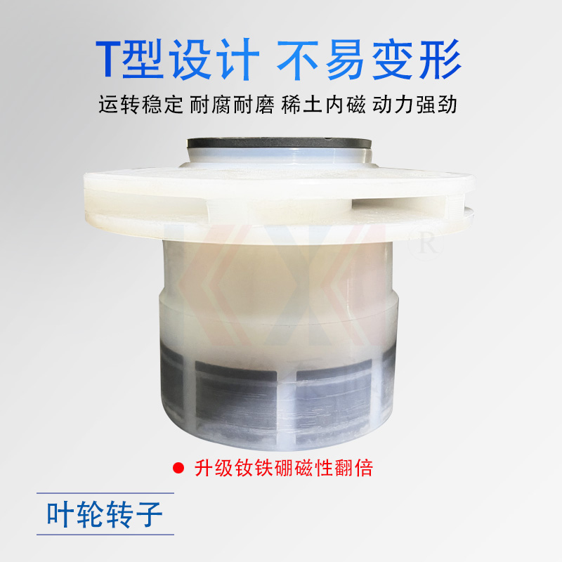 IMC型氟塑料磁力泵,過流部件使用氟塑料及合金復合材料制造,是應用磁力學原理,利用內外永磁體傳動,實現扭矩無接觸傳遞,當電動機帶動外轉子總成旋轉時,通過磁場的作用磁力線穿過隔離套帶動內轉子總成和葉輪同步旋轉,外轉子旋轉時隔離套靜止,隔離套將介質完全密封,從而達到無泄漏輸送介質的目的。解決了機械傳動泵的軸封跑、冒、滴現象。